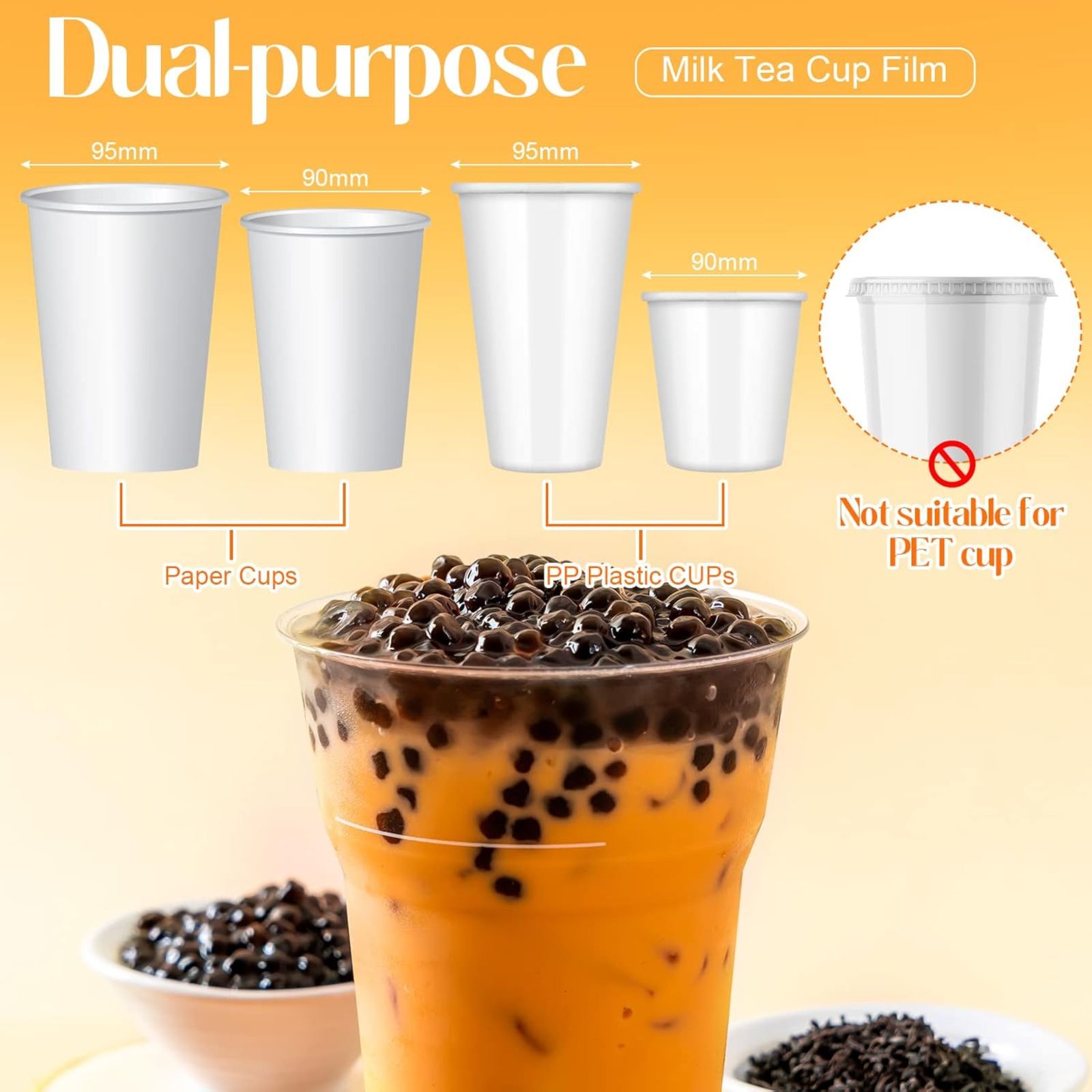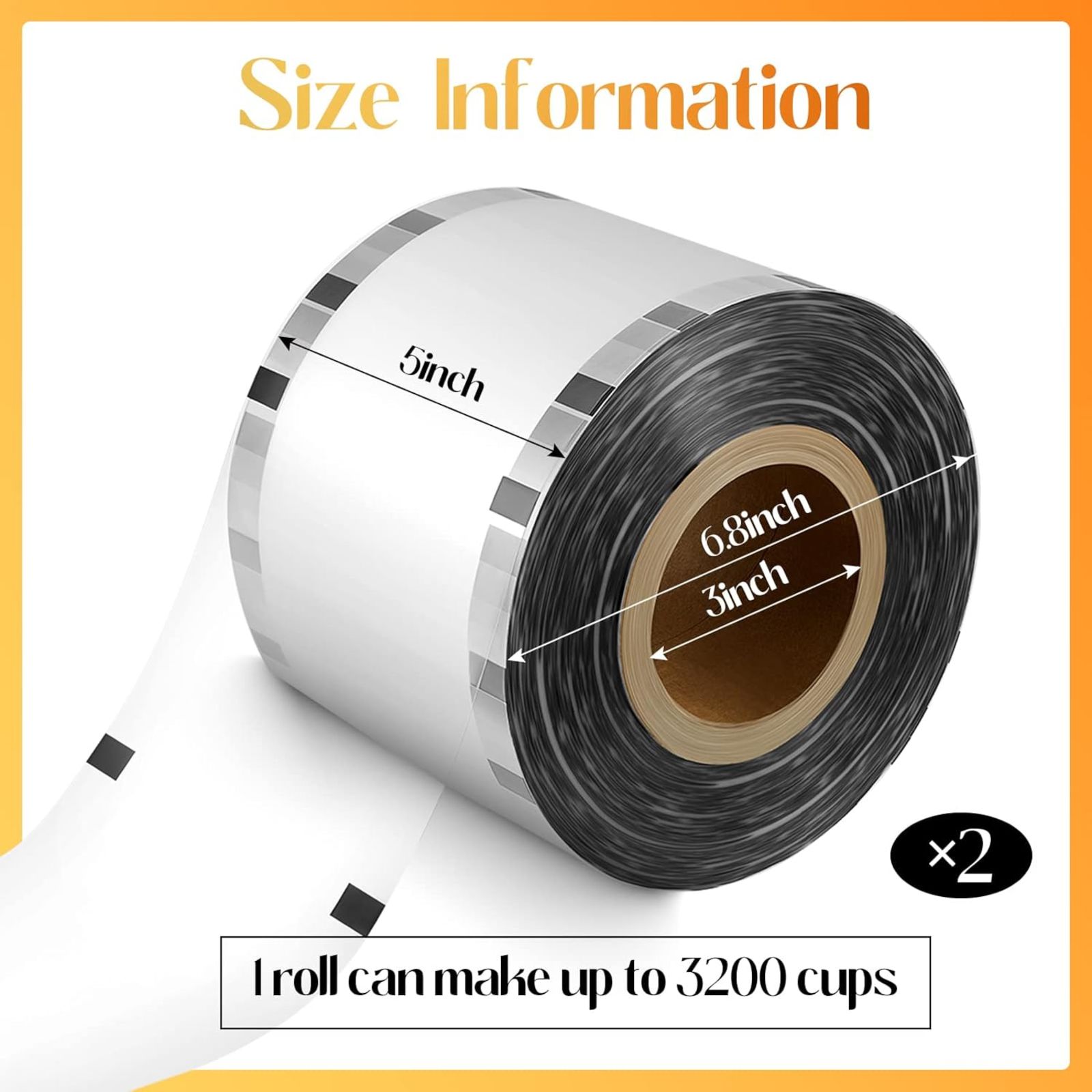 Cada rollo tiene capacidad para sellar aproximadamente 3,200 vasos, ofreciendo un excelente rendimiento para operaciones de mediano y alto volumen como cafeterías, tiendas de té de burbujas, juguerías, restaurantes de comida rápida y cantinas escolares.